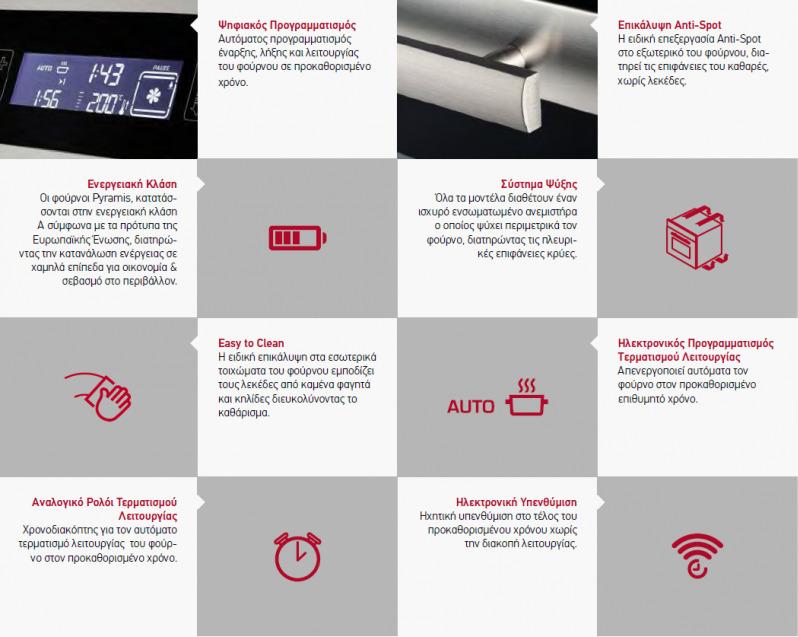 - H ειδική επεξεργασία Anti-Spot στο εξωτερικό του φούρνου, διατηρεί τις επιφάνειες του καθαρές, χωρίς λεκέδες.