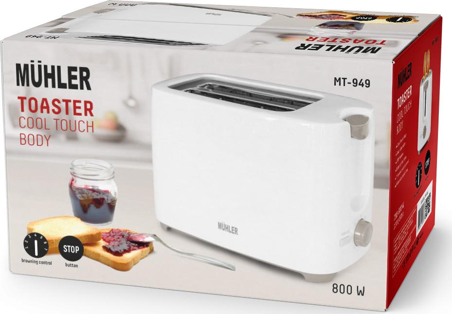 - Η φρυγανιέρα MT-949 της εταιρείας Muhler διαθέτει ισχύ 800 Watt και υποδοχές για 2 φέτες ψωμιού. Μπορεί να εξυπηρετήσει τις ανάγκες ενός ή και δύο ατόμων για την καθημερινή παρασκευή του πρωινού ή του σνακ.